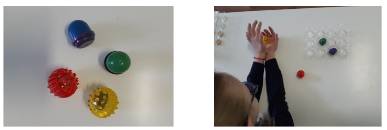 -Игра с массажными шариками и эластичными кольцами. Данный метод очень помогает развивать мелкую моторику рук. Подходит для детей с разными нарушениями. Снижается уровень мышечной зажатости, психоэмоционального напряжения.