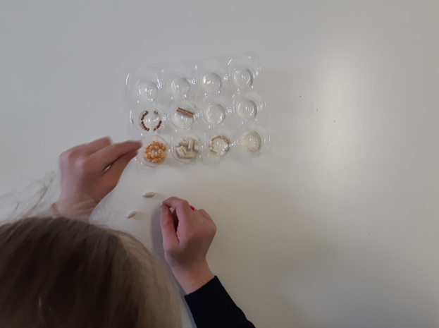 -Игра «Разбери зёрна по домикам». В этой игре я использую пластиковые отверстия для сбора зёрен, а также сами зёрна различного размера и формы: фасоль, гречку, рис, перловку. Игра заключается в том, чтобы разложить зёрна из общей массы в свои домики. Сложность заключается в захвате зерна с гладкой поверхности и распределении по форме, цвету, размеру. Эта игра очень нравится детям. Она очень хорошо развивает мелкую моторику, позволяет изучать форму, цвет предметов, знакомит с названиями и видами зерновых культур.